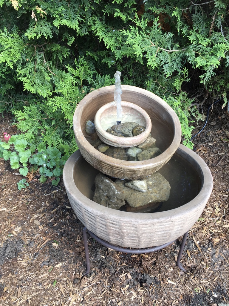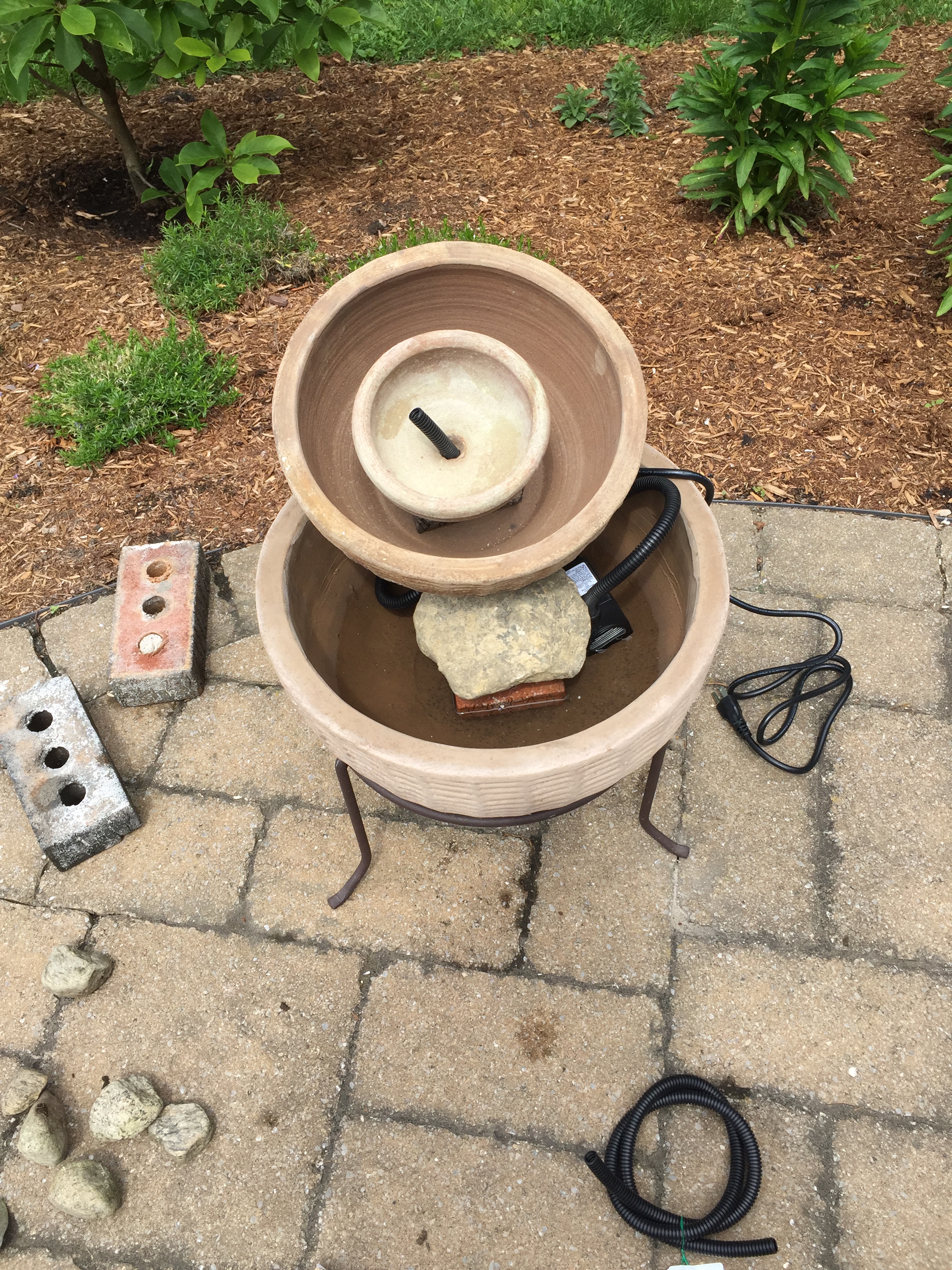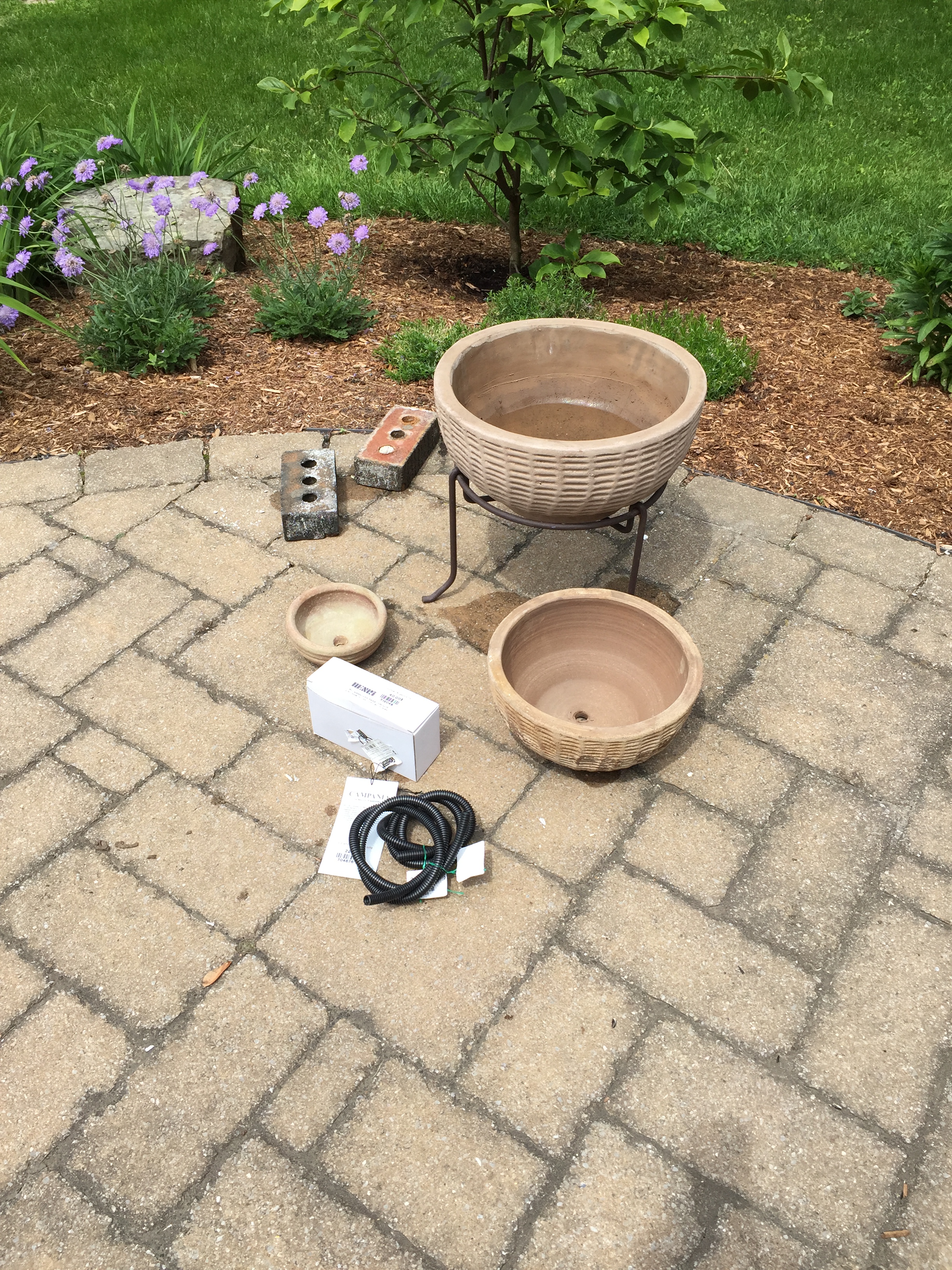 Il faut choisir trois plats en céramique ou terre cuite ayant un trou de drainage au fond. Le trou du plus grand plat, qui sert de base à l’abreuvoir, sera bouché avec un bouchon de liège. Un bouchon de vin fait l’affaire. Ces trois plats peuvent être idéalement de même style mais doivent être de tailles différentes, pour donner l’effet de cascade. La pompe et le tuyau se vendent en centre de jardin pour une cinquantaine de dollars. On ajoute quelques pierres ou briques, pour assurer une stabilité au montage. J’ai installé la base de l’abreuvoir sur un support à pot métallique, mais elle aurait pu reposer directement par terre.
