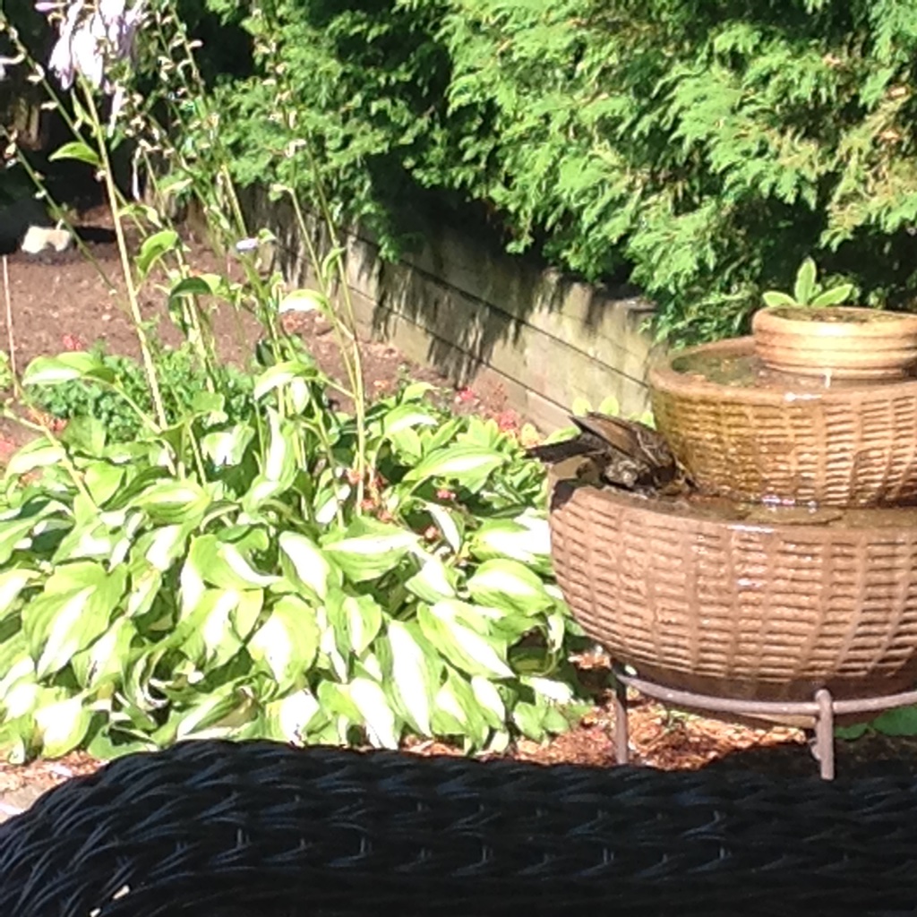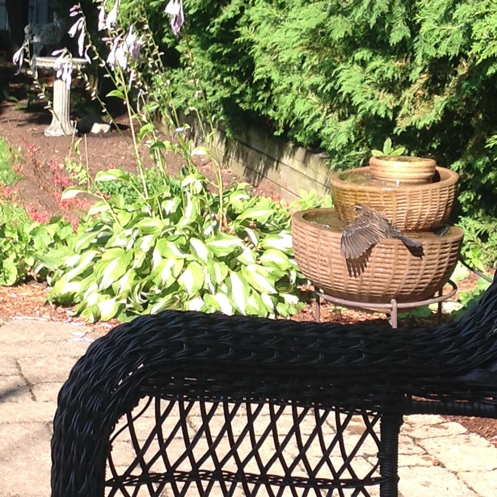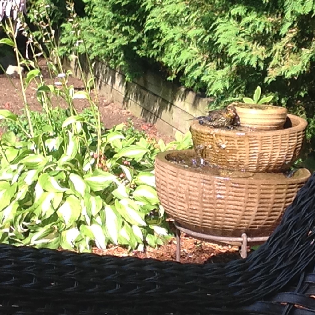 Il suffit d’agencer le tout pour que cela soit esthétiquement agréable. On ajoute de l’eau, on branche et voilà! Nous avons choisi d’installer l’abreuvoir près d’une haie pour cacher l’extension électrique et mieux l’intégrer dans l’aménagement paysager. L’abreuvoir devra être vidé et nettoyé assez régulièrement, aux deux ou trois semaines environ. Le bouchon au fond du plat qui est à la base est donc pratique à ce moment. Il suffit de le retirer pour réaliser la vidange. Il faut ajouter de l’eau presque tous les jours, selon le niveau d’utilisation des oiseaux et la chaleur environnante.