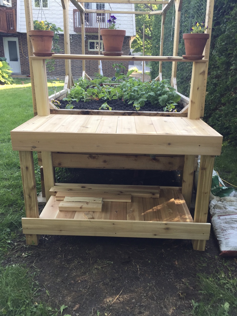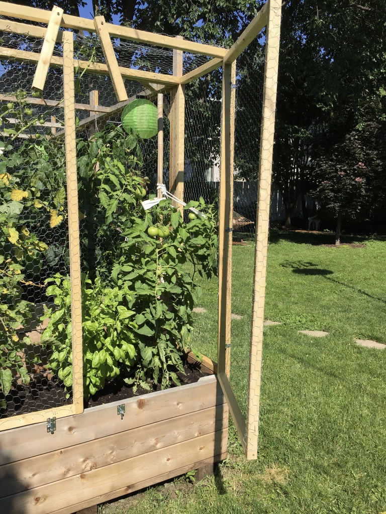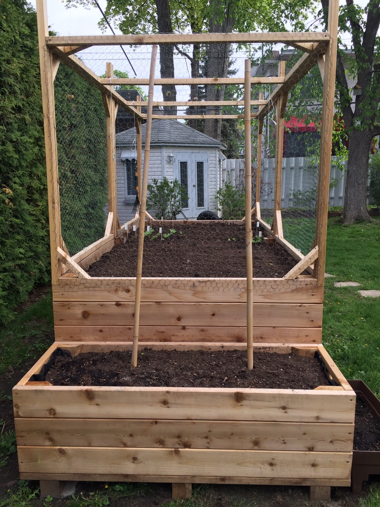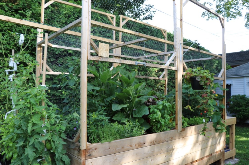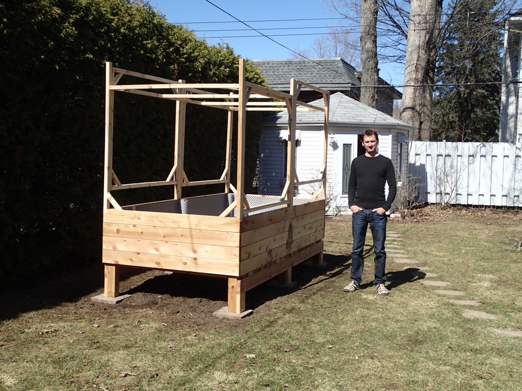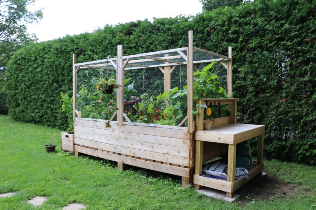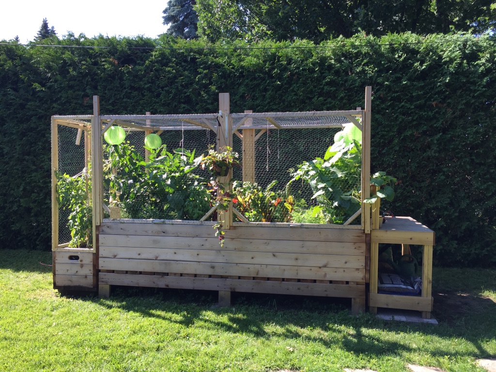 Mon cucurbitacée m’a construit un potager en bac, l’été suivant l’année de notre arrivée à la nouvelle maison. La structure a été construite avec du bois de cèdre rouge de l’ouest canadien. Ce bois, non traité, ne transmet pas de substance chimique toxique à la terre ou aux végétaux et tolère les éléments naturels tout en prenant une belle patine grisâtre, au fil des saisons. Mon ingénieur de mari a ajouté des fenêtres avec grillage à poules pour protéger la future récolte des indésirables tels qu’écureuils et ratons-laveurs. Les fenêtres s’ouvrent en hauteur, pour le potager principal et à l’horizontal pour la section plus basse réservée aux tomates et basilic, deux compagnons naturels.