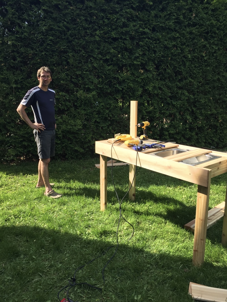 Au bac de jardin, nous avons ajouté un banc construit avec les même matériaux. Le banc est utile pour nettoyer les légumes, lors de la récolte, avec son évier dissimulé sous une partie amovible.