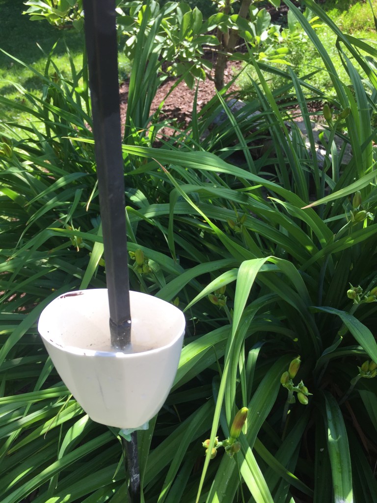 Le désagrément du liquide sucré, c’est qu’il attire aussi les fourmis. Mon Cucurbitacee de mari a trouvé une manière originale de régler définitivement ce problème, en utilisant le capuchon d’une bouteille de plastique préalablement coupée en deux. Cette pièce découpée (conserver environ 5 centimètres) est glissée par le haut du support métallique de l’abreuvoir, puis maintenue en place avec de la colle chaude. Ce « gobelet », une fois rempli d’eau, a pour effet d’empêcher les fourmis de monter vers le nectar sucré. En plus de maintenir un bon état de propreté, l’abreuvoir, sans présence d’insectes, est plus attirant pour les colibris.